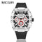 A refined silver chronograph with red performance dials — elegance meets aggression. The Silver Storm Edition embodies speed, precision, and modern engineering. Perfect for the gentleman who demands attention.